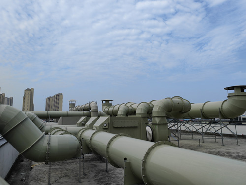 檢測室煙粉塵 → 靈活性炭包過濾裝置器 → 引羅茨風機 → 排放量